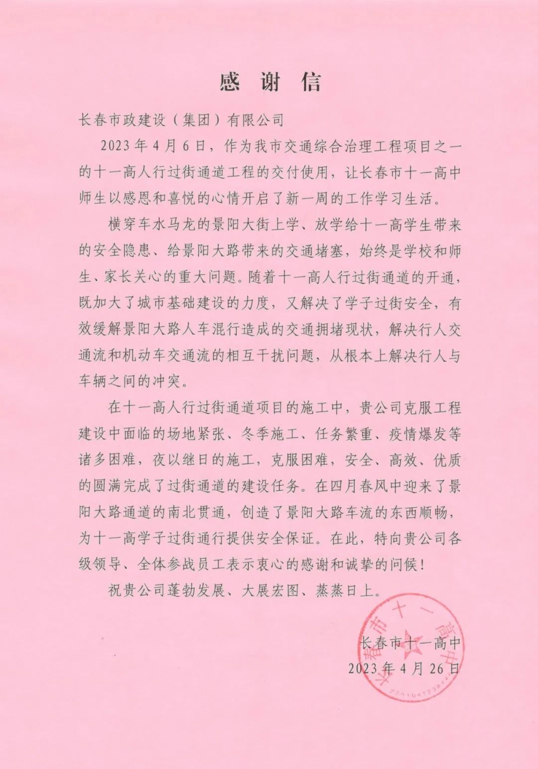吉林大学隶属中学和长春市十一高中划分为集团公司送来锦旗及谢谢信,充分表达了对公司所承建项目宁静文明施工及工程质量的高度认可;对公司项目治理团队强大的组织治理能力以及在困难面前勇于继续、拼搏奋进的精神风貌给予高度肯定和赞扬。